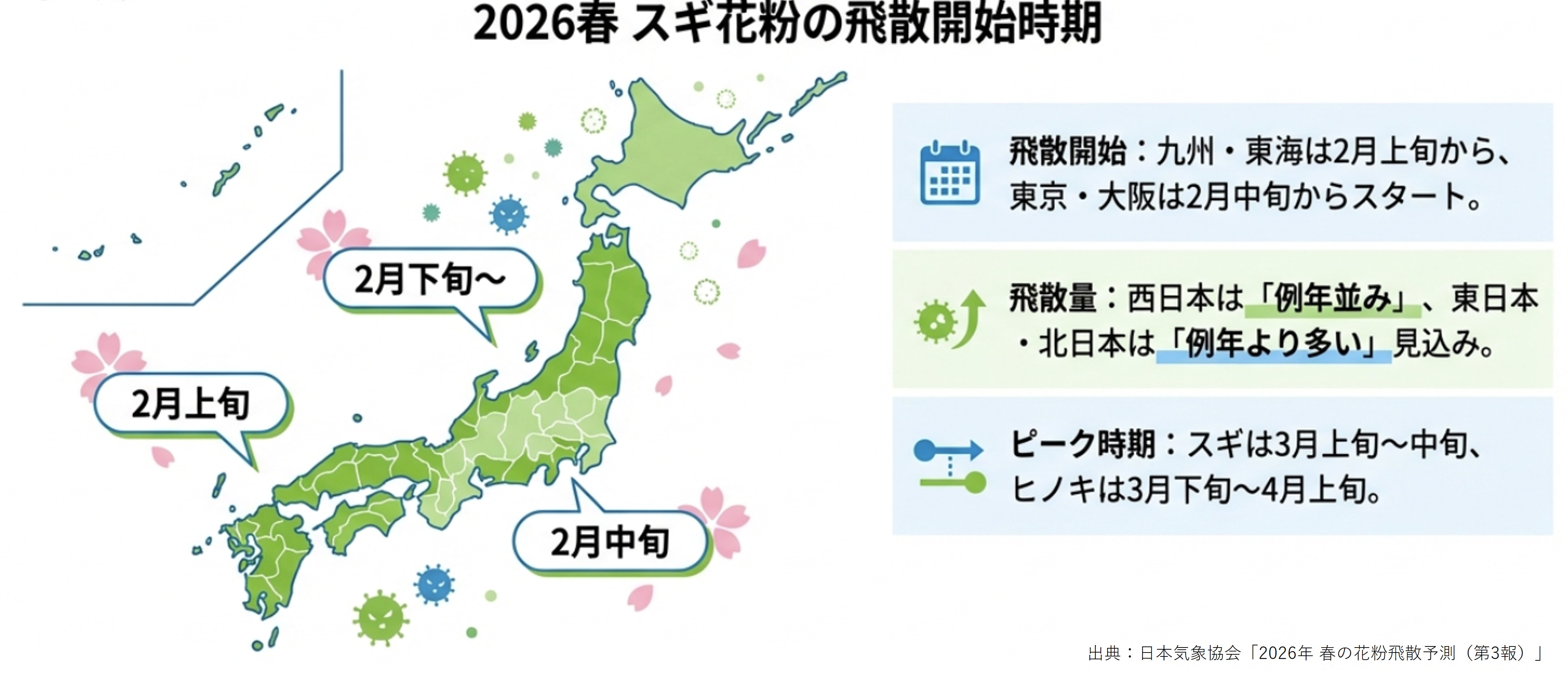 飛散量は、西日本では例年並み、東日本と北日本では例年より多い予測となっています。