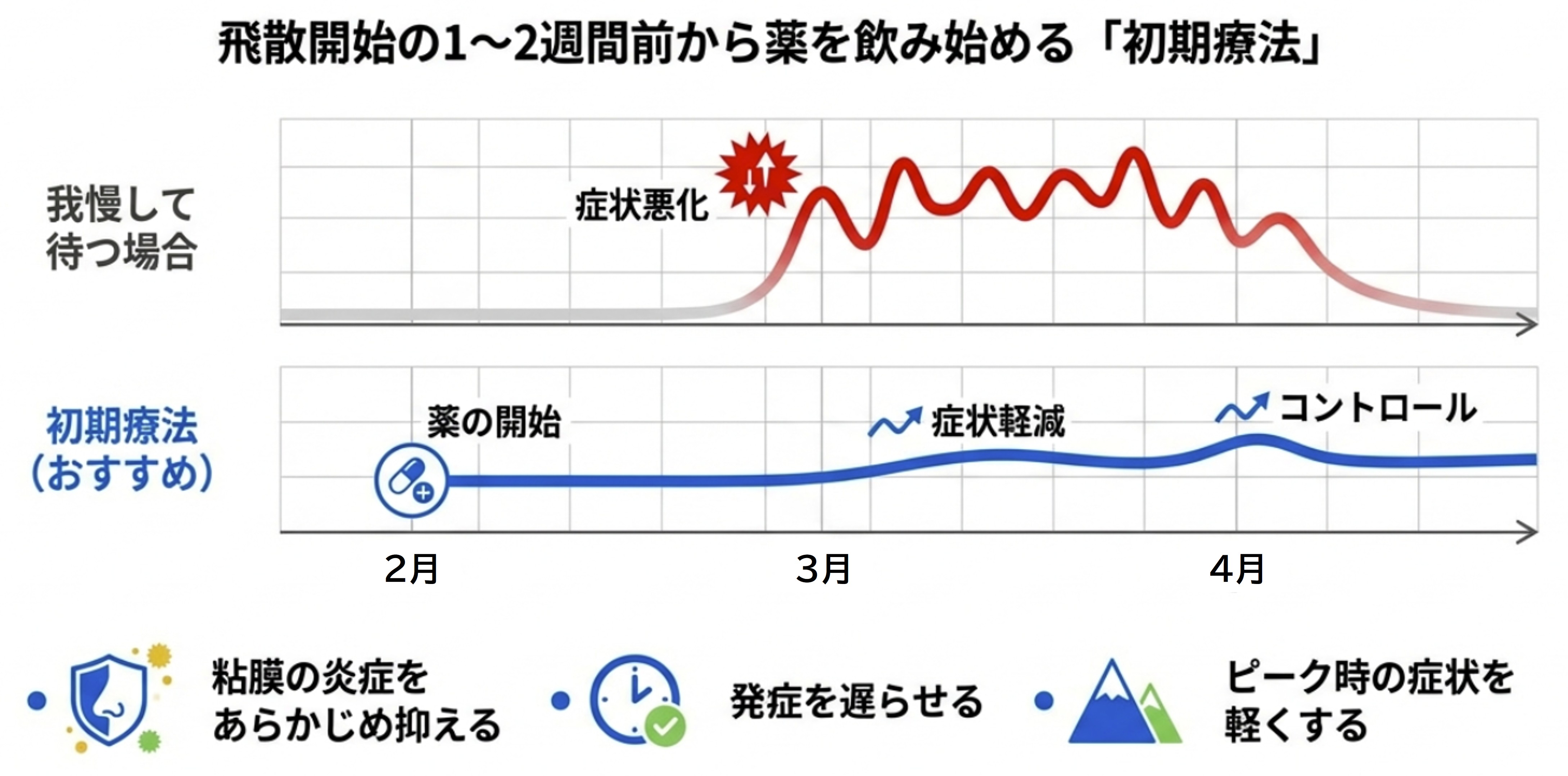 症状が悪化してから慌てて薬を飲み始めても、すでに粘膜で強い炎症が起きているため、効果を実感できるまでに時間がかかることがあります。「初期療法」によってあらかじめ炎症を抑えておくことで、発症を遅らせる、あるいはシーズン中のピーク時の症状をグッと抑えることが可能になります。