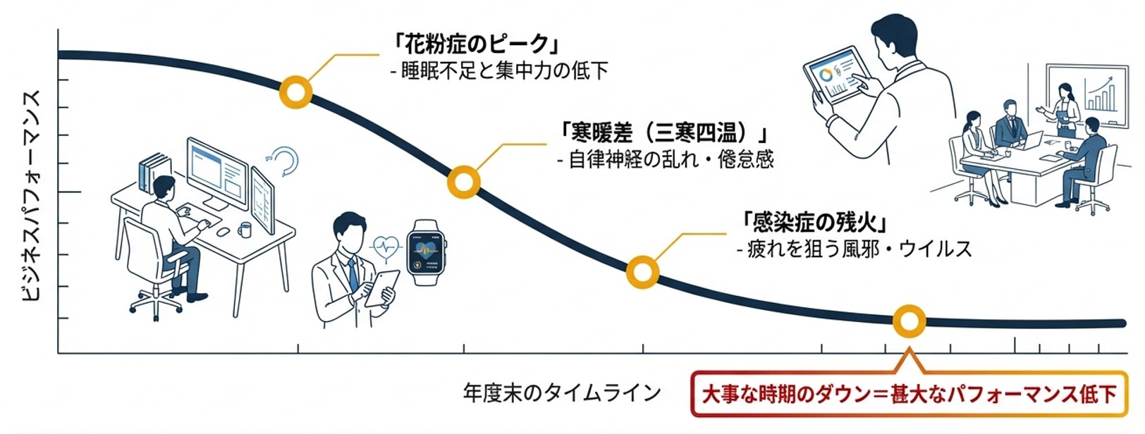 - 花粉症のピーク:鼻詰まりによる睡眠不足と集中力の低下。