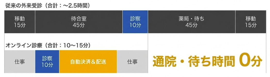 会議の間や移動中などにスマホで受診。通院時間も待合室での待機も「ゼロ」になります。
