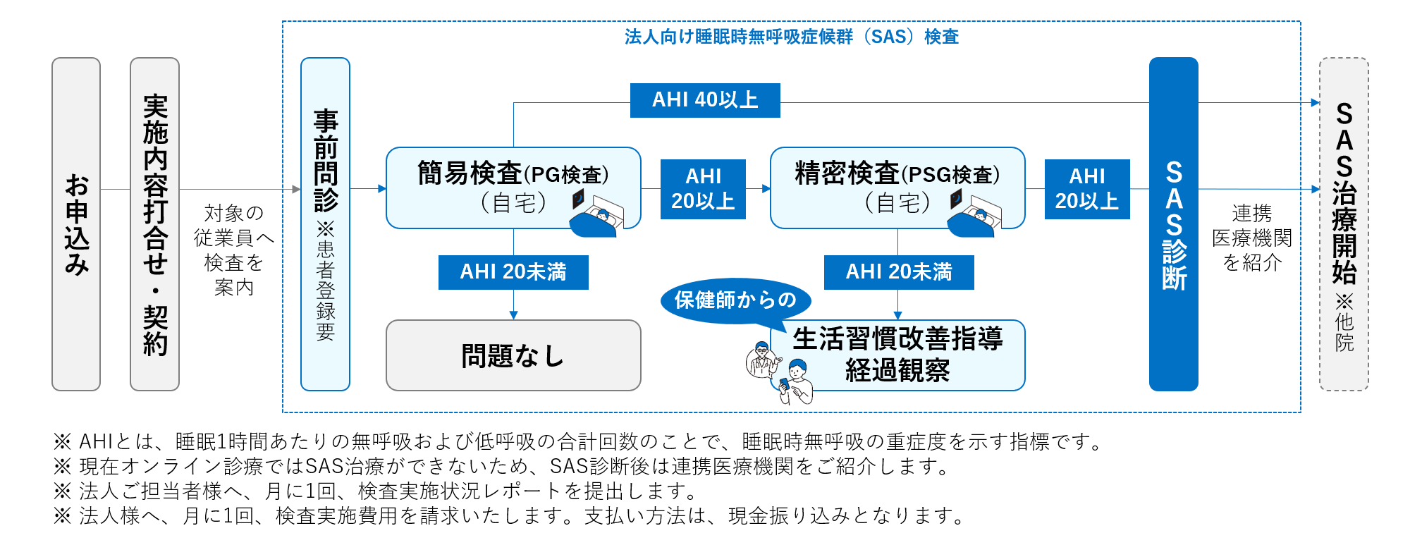 - 精密検査(PSG検査)の結果、異常がなければ経過観察・生活習慣改善、SASと診断がされた場合は、連携医療機関を紹介のうえ、CPAP治療に進みます。