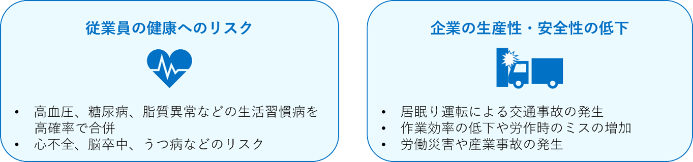質の良い睡眠が取れず、就業中に強い眠気を感じることがあるSASの症状。放っておくと従業員の健康への影響はもちろん、企業にとっても様々なリスクが考えられます。