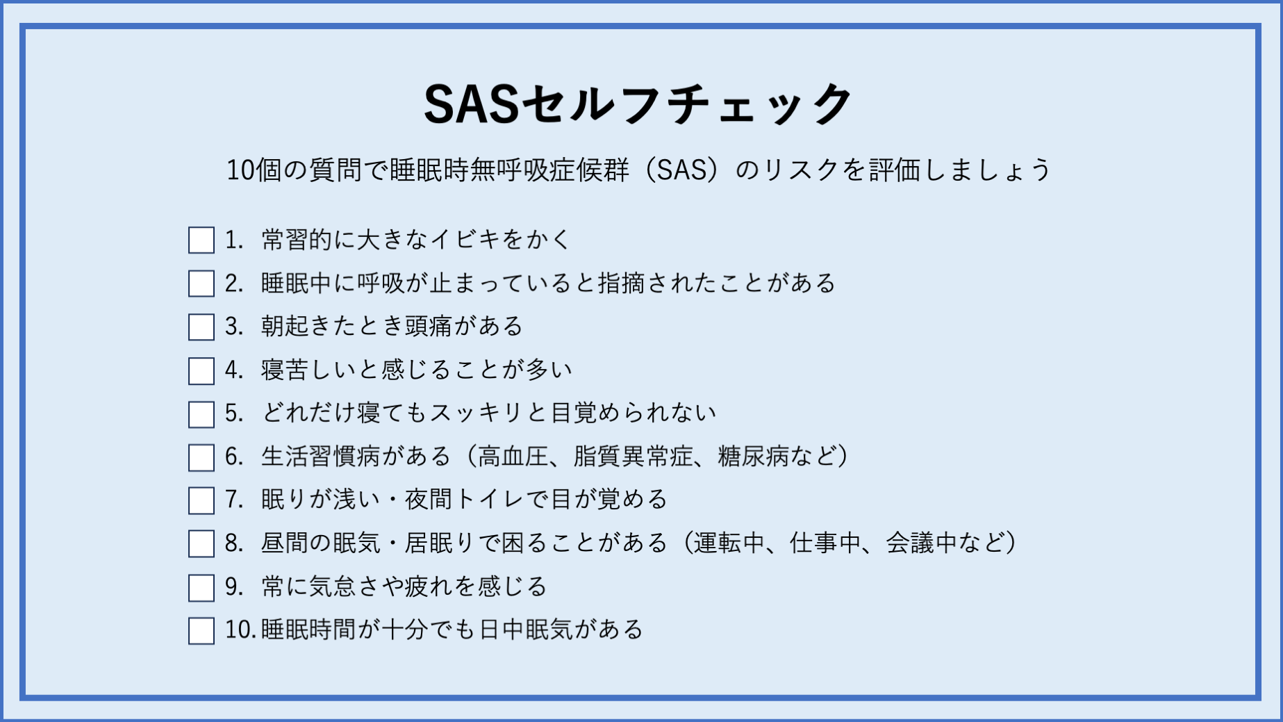 SASの重症化リスク・・・SASは自覚症状が少ない場合が多いですが、日常生活に様々な影響を及ぼす可能性から、早期発見・早期治療が鍵となります。